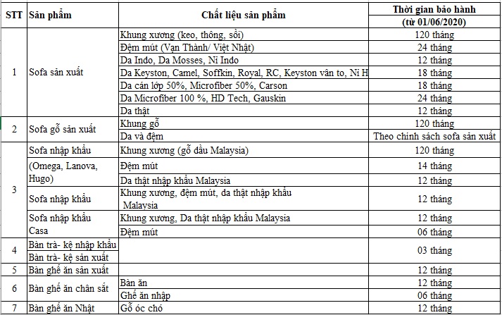 | 1 | Sofa nhập khẩu | Khung | 60 tháng |